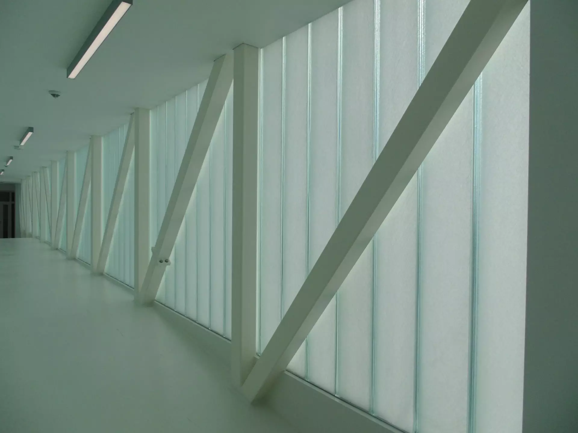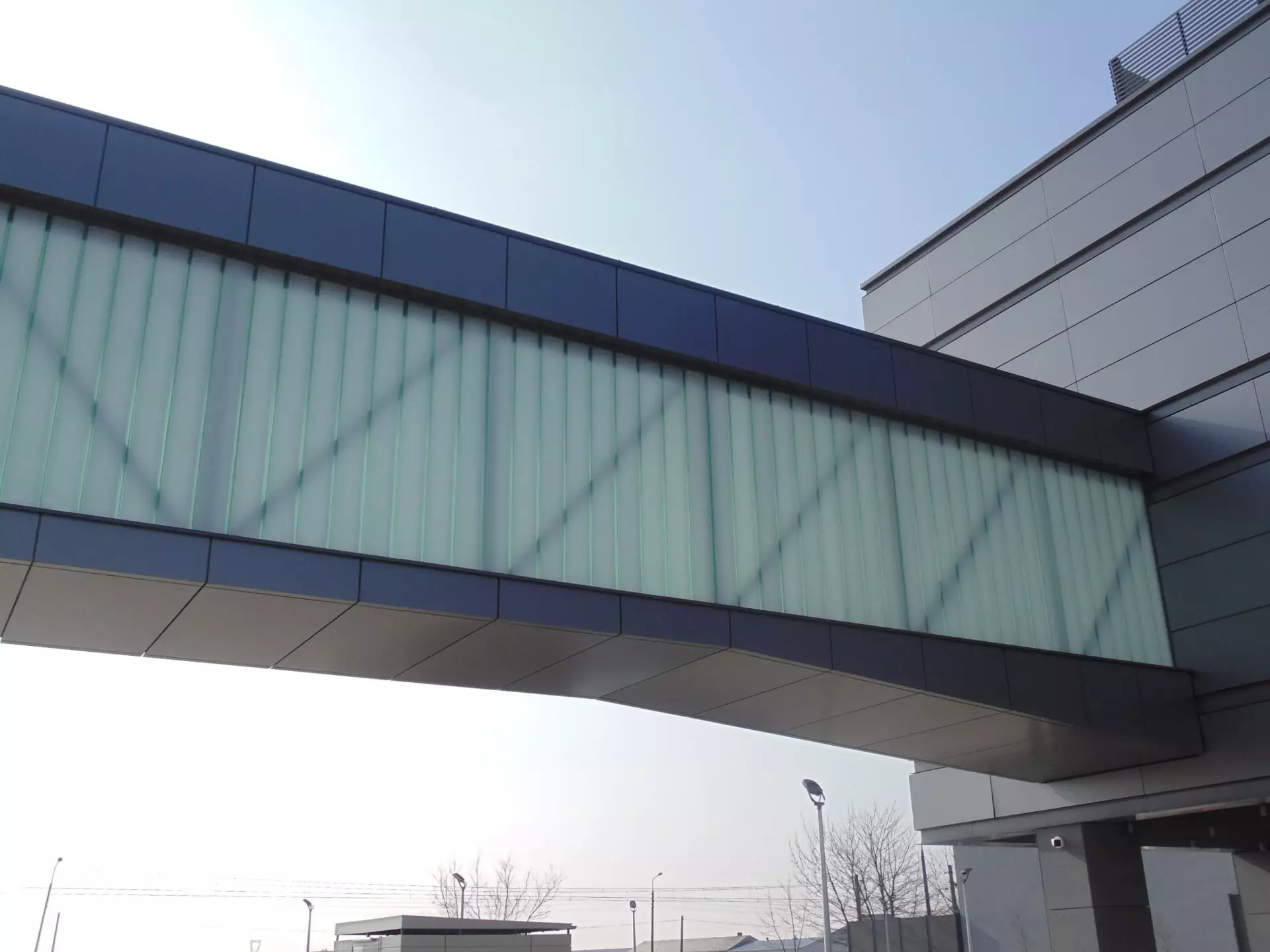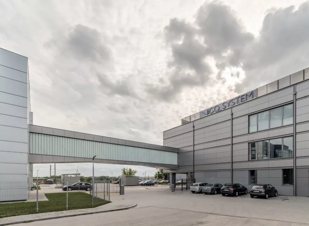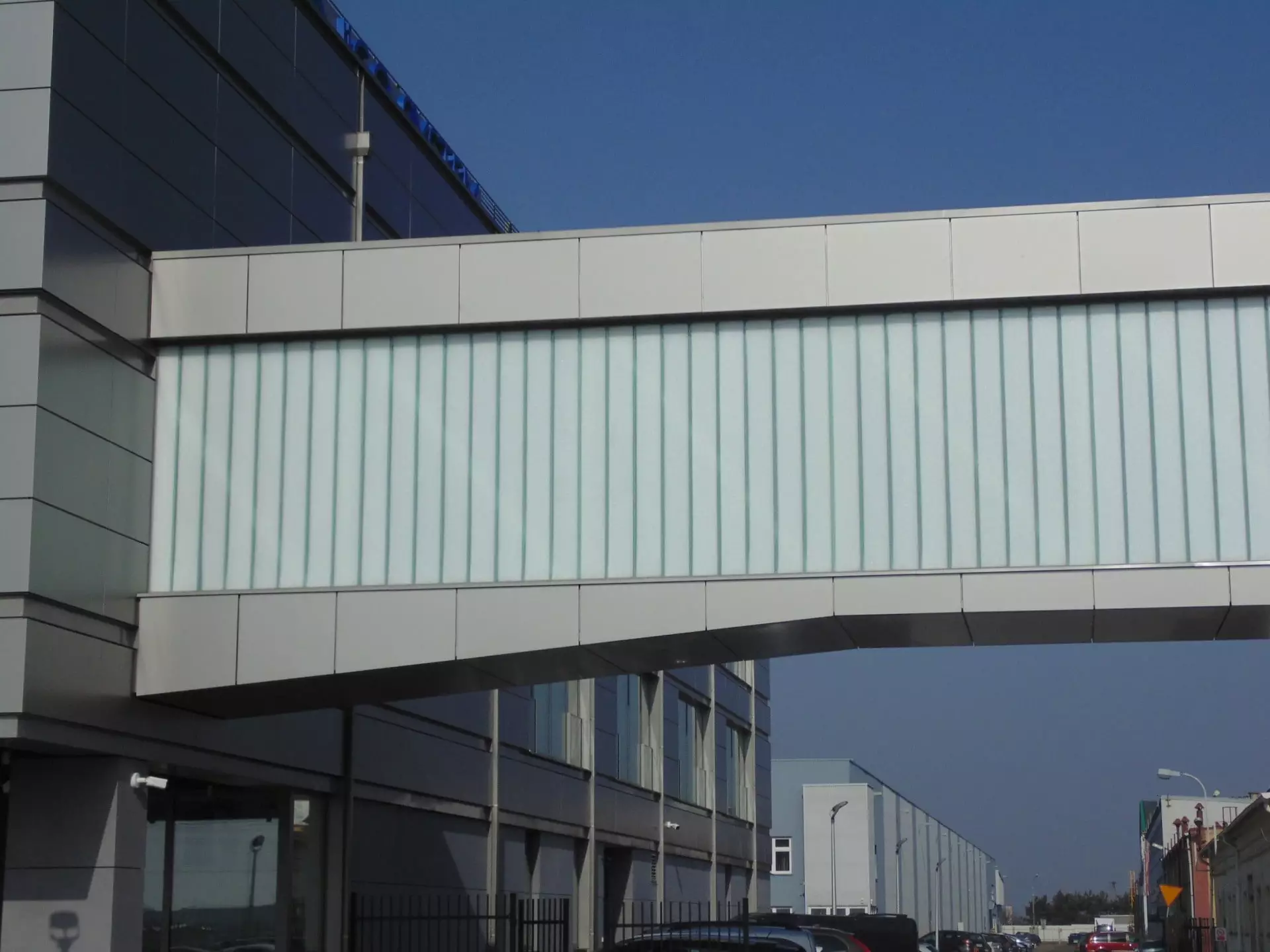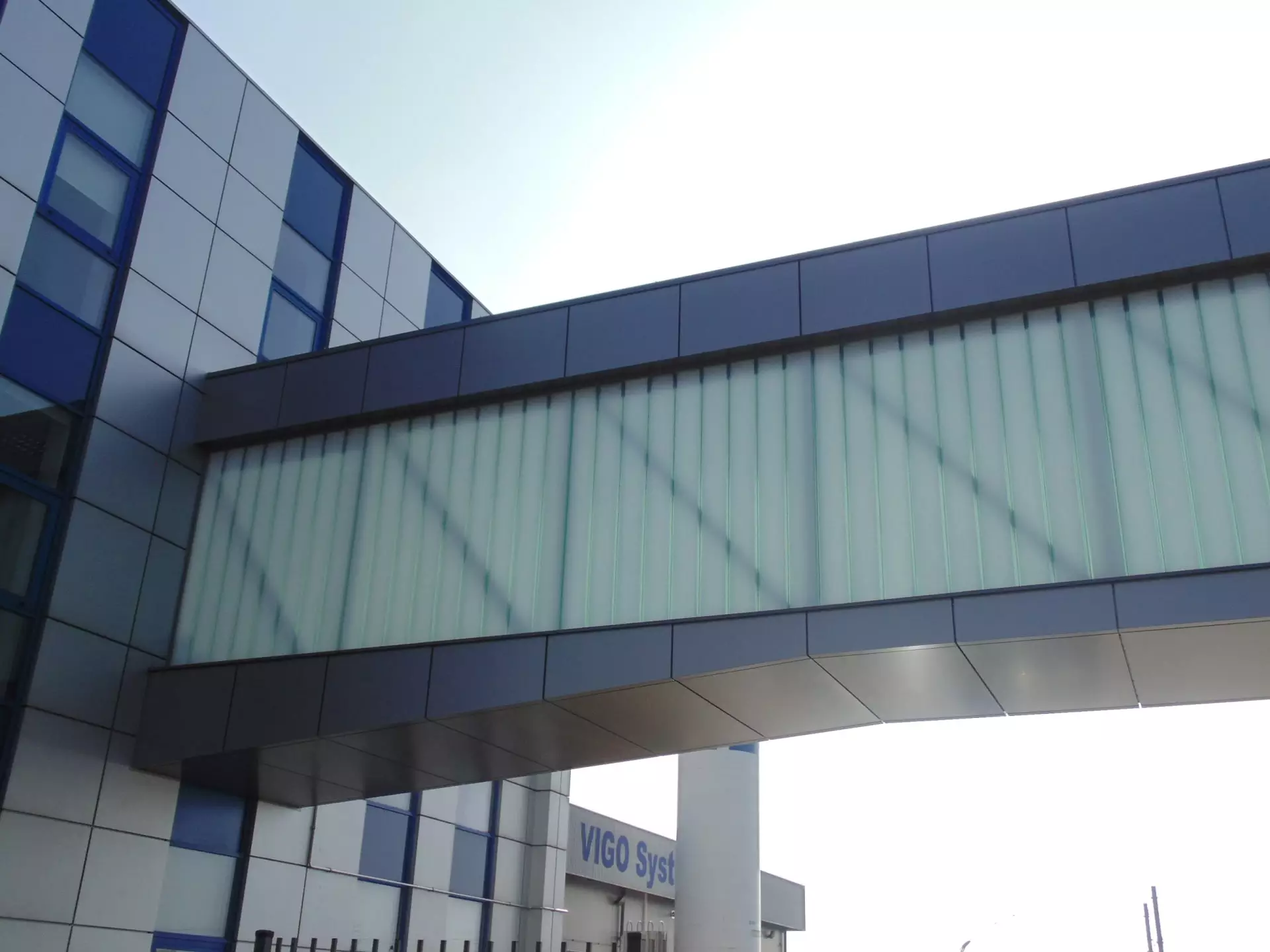 VIGO System – wykonaliśmy szklenie łącznika budynków biurowo-labolatoryjno-produkcyjnych. Projekt obiektu powstał za sprawą biura BUJNOWSKI. Szklenie łącznika zostało wykonane z dyli szklanych LINIT®EcoGlass P26/60/7 504 Perl z wkładką termoizolacyjną.