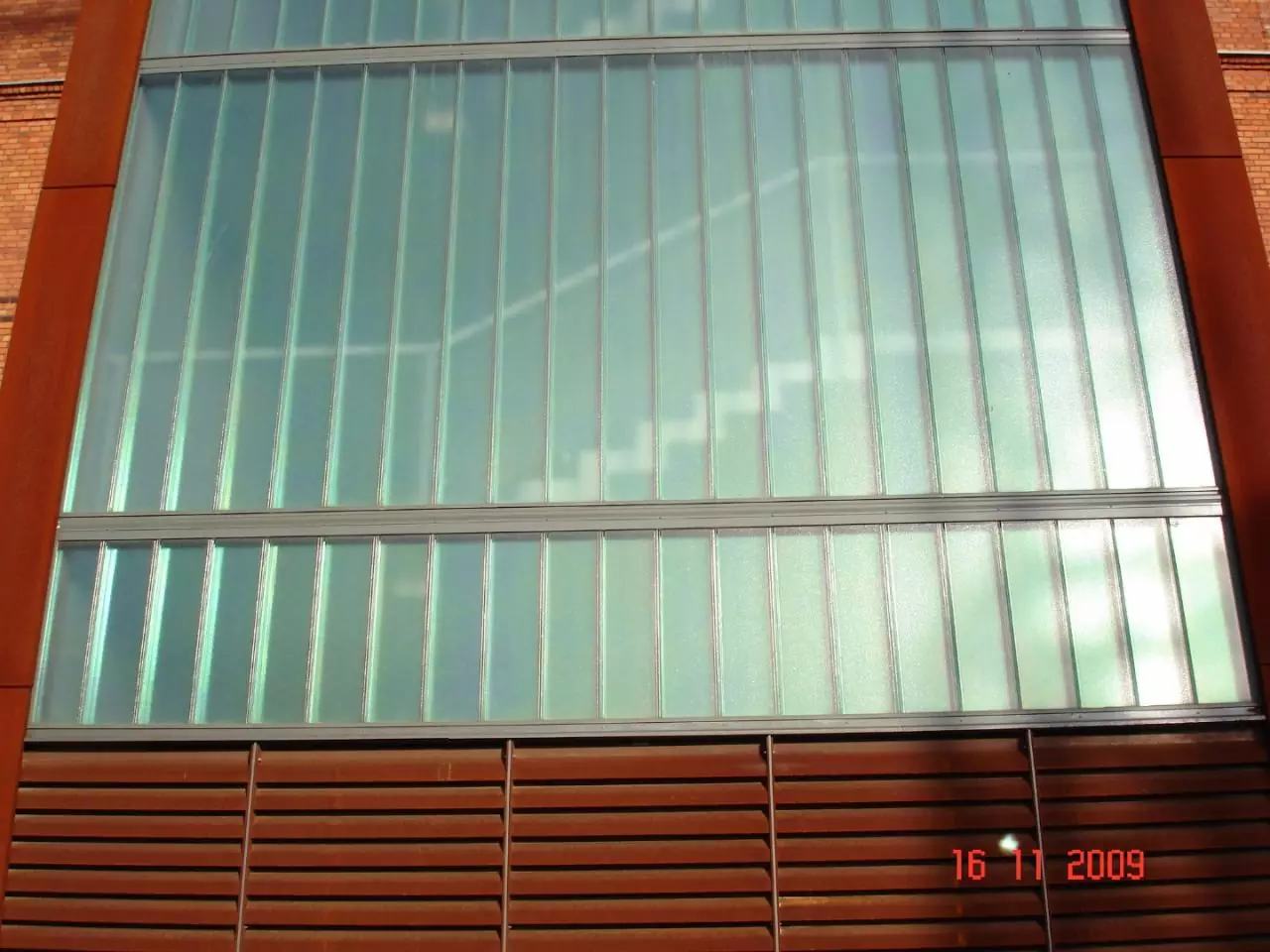 Szkło profilowane podwójne. Przeszklenia wykonane w systemie Pilkington Profilit w układzie pionowym.