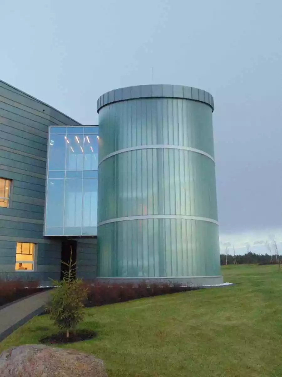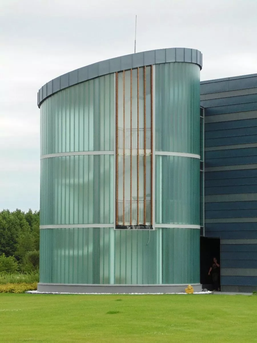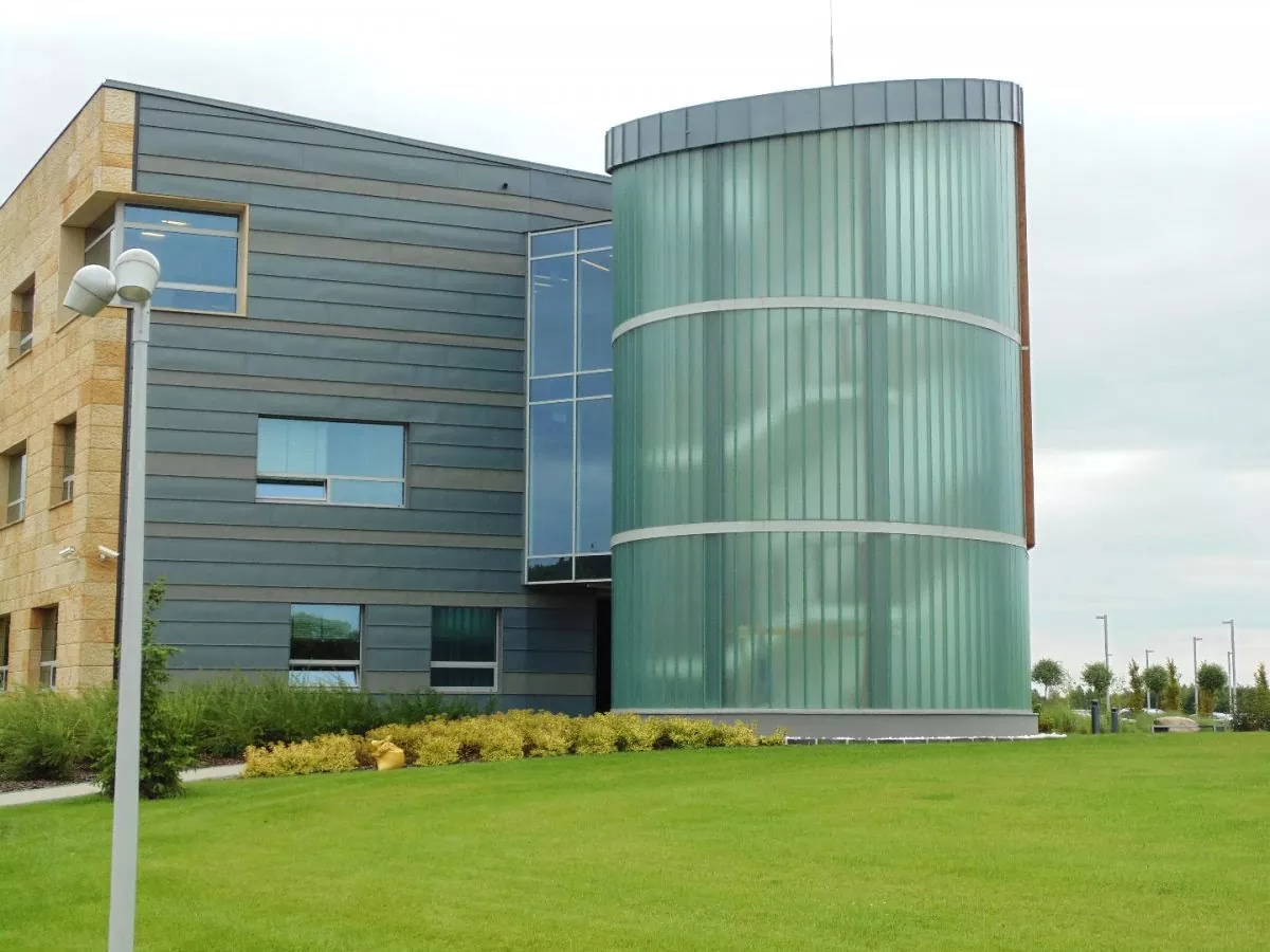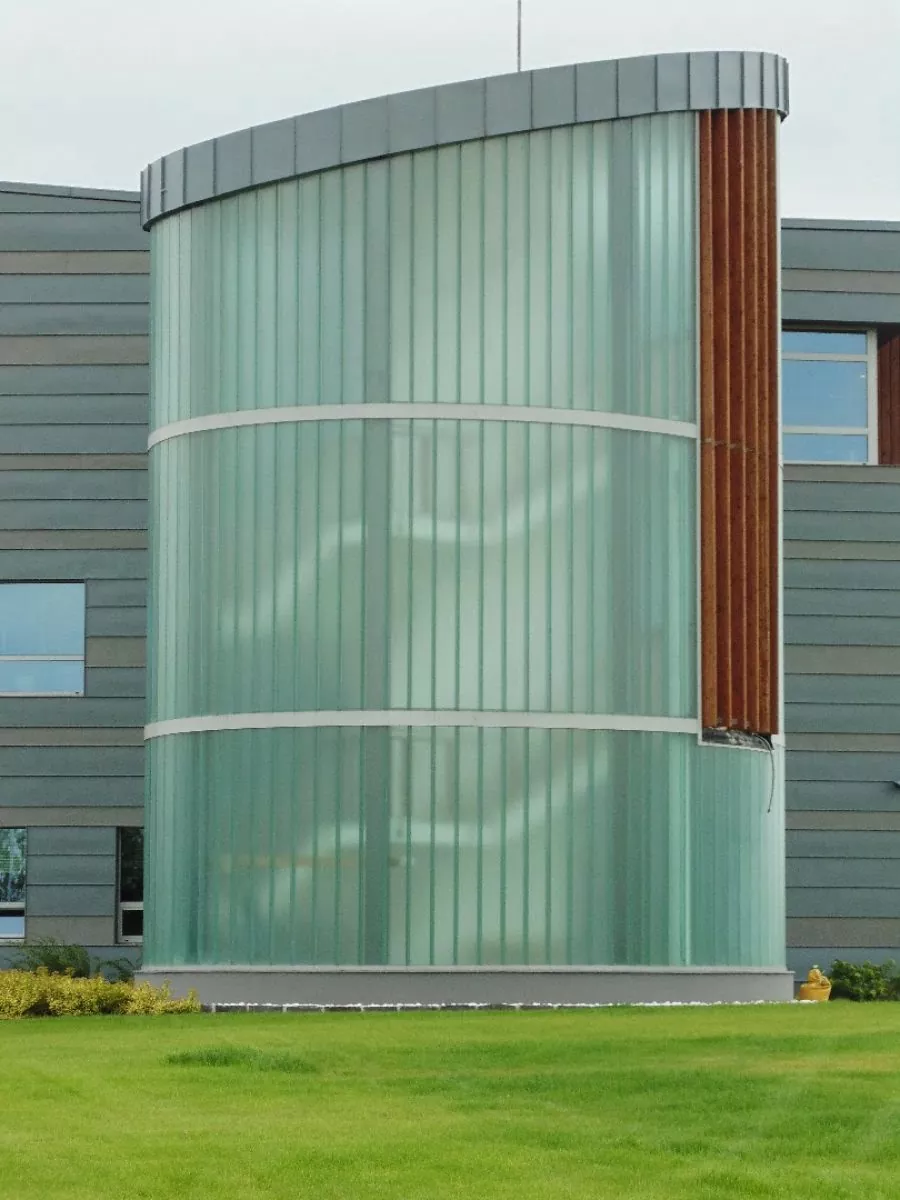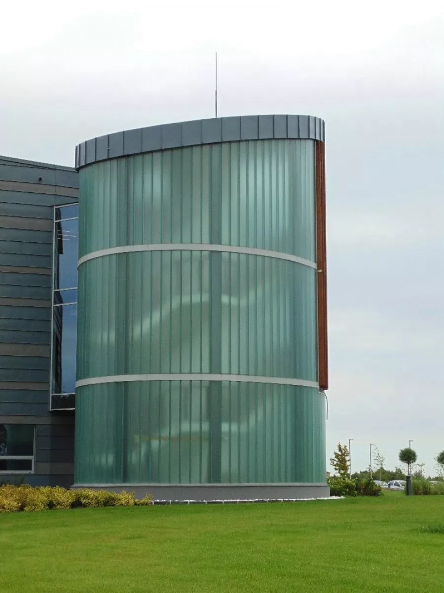 Nowoczesna konstrukcja miała dodać budynkowi lekkości oraz profesjonalnego wyglądu, a jednocześnie zapewnić odpowiedni dopływ światła. W celu realizacji projektu wykonaliśmy autorski projekt konstrukcji stalowej, który optymalnie realizował założenia funkcjonalne – dodając budynkowi nowoczesnego charakteru i zapewniając pracownikom komfortowe i bezpieczne przemieszczanie się między piętrami. Zastosowanie szklenia pionowego pozwoliło osiągnąć ciekawy efekt estetyczny i nadać konstrukcji lekkości, a rotundowy kształt dobrze komponuje się z pozostałymi elementami konstrukcji budynku. Przy realizacji projektu zastosowano technikę szklenia podwójnego Profilit K25/60/7, które zapewnia efektywną ochronę przed zróżnicowanymi warunkami atmosferycznymi na zewnątrz.