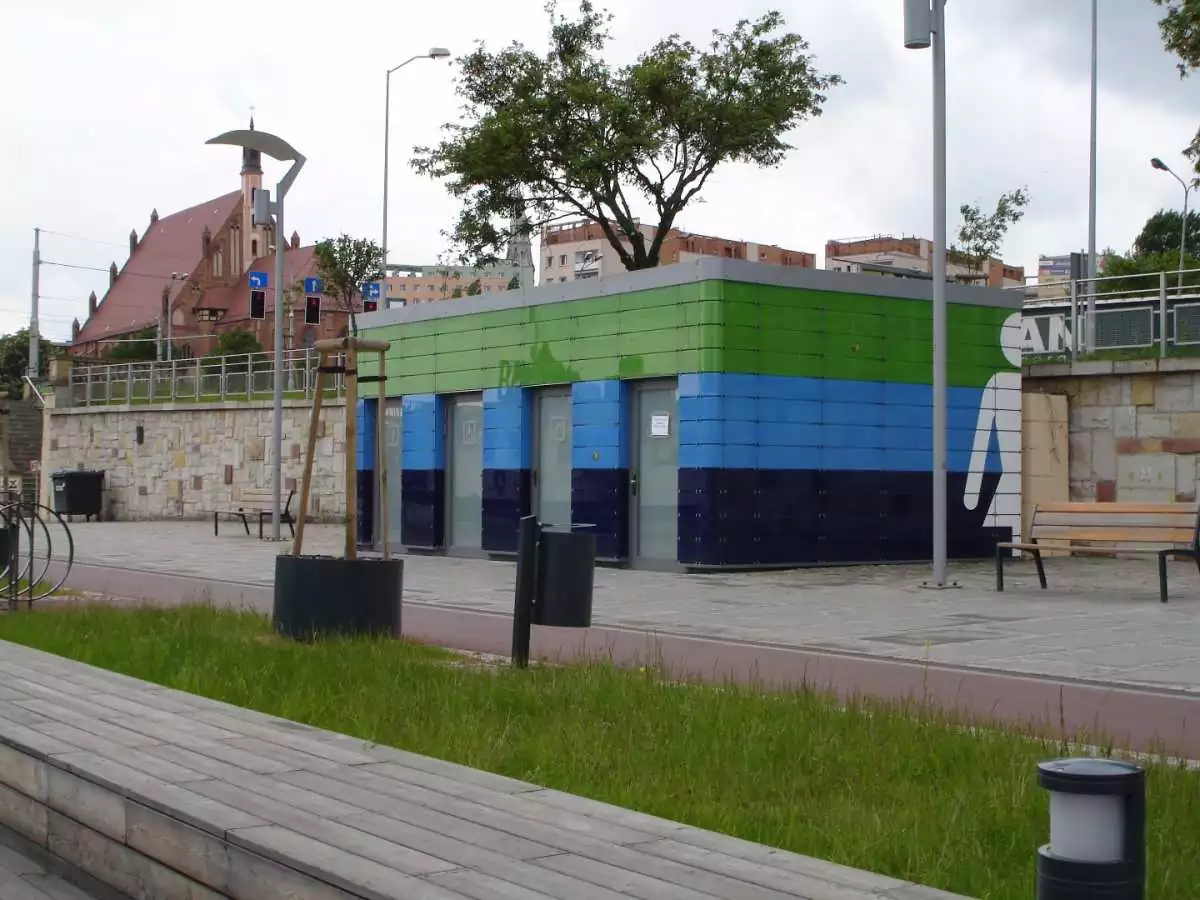 WC na Bulwarze Piastowskim w Szczecinie Fasada wykonana w formie szklanej fasady wentylowanej.