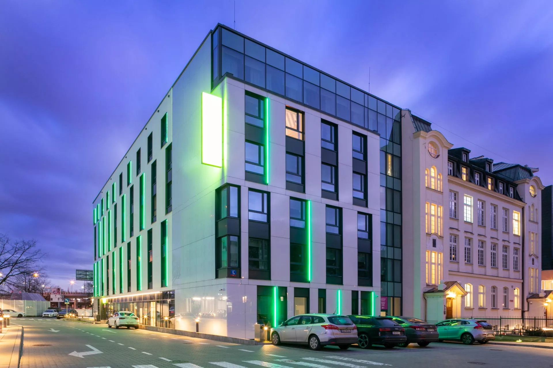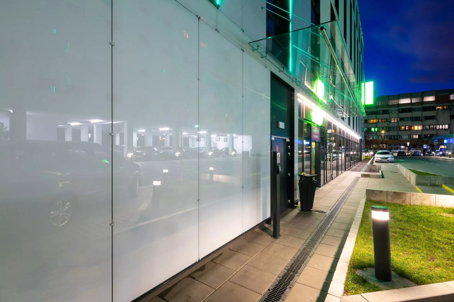 Aby osiągnąć ten cel, postawiliśmy na wykorzystanie szkła emaliowanego w kolorze RAL 9016, który dodaje elegancji i nowoczesności całej konstrukcji. Szkło to, z jego wybielonym i emaliowanym wykończeniem, nie tylko tworzy interesujące efekty świetlne w ciągu dnia, ale także w nocy ożywiane jest oświetleniem LED, które dodatkowo podkreśla geometryczne walory elewacji.