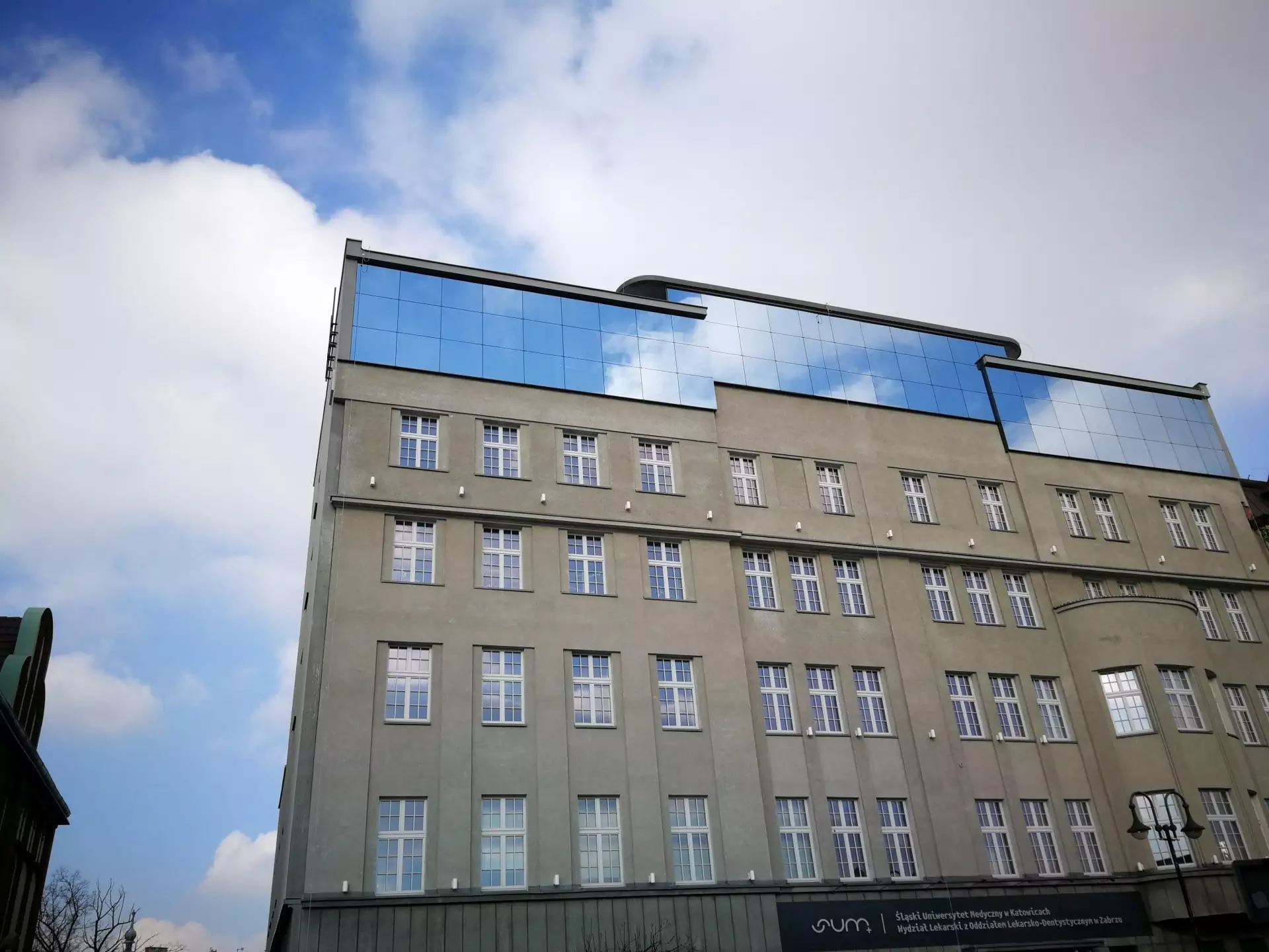 Śląski Uniwersytet Medyczny w Zabrzu, elewacja szklana została wykonana w naszym systemie fasady szklanej wentylowanej ST-System. Projektanci z An Archi Group Sp. z o.o. z Gliwic przywrócili drugie życie obiektowi z 1913 r. w porozumieniu ze służbami konserwatorskimi odtwarzając historyczny wygląd elewacji z 1926r.