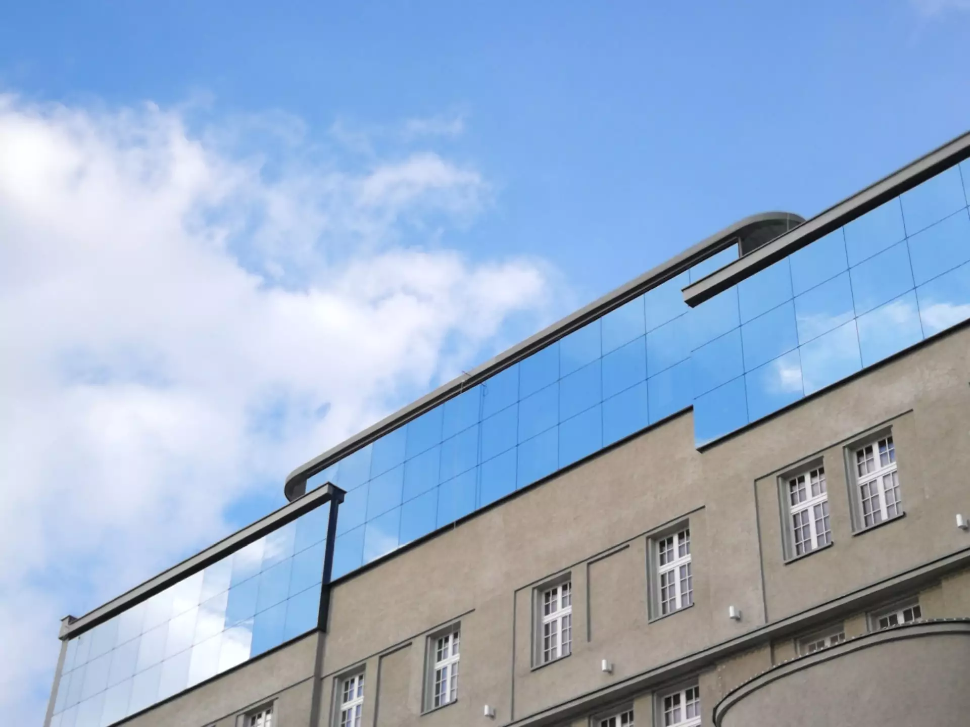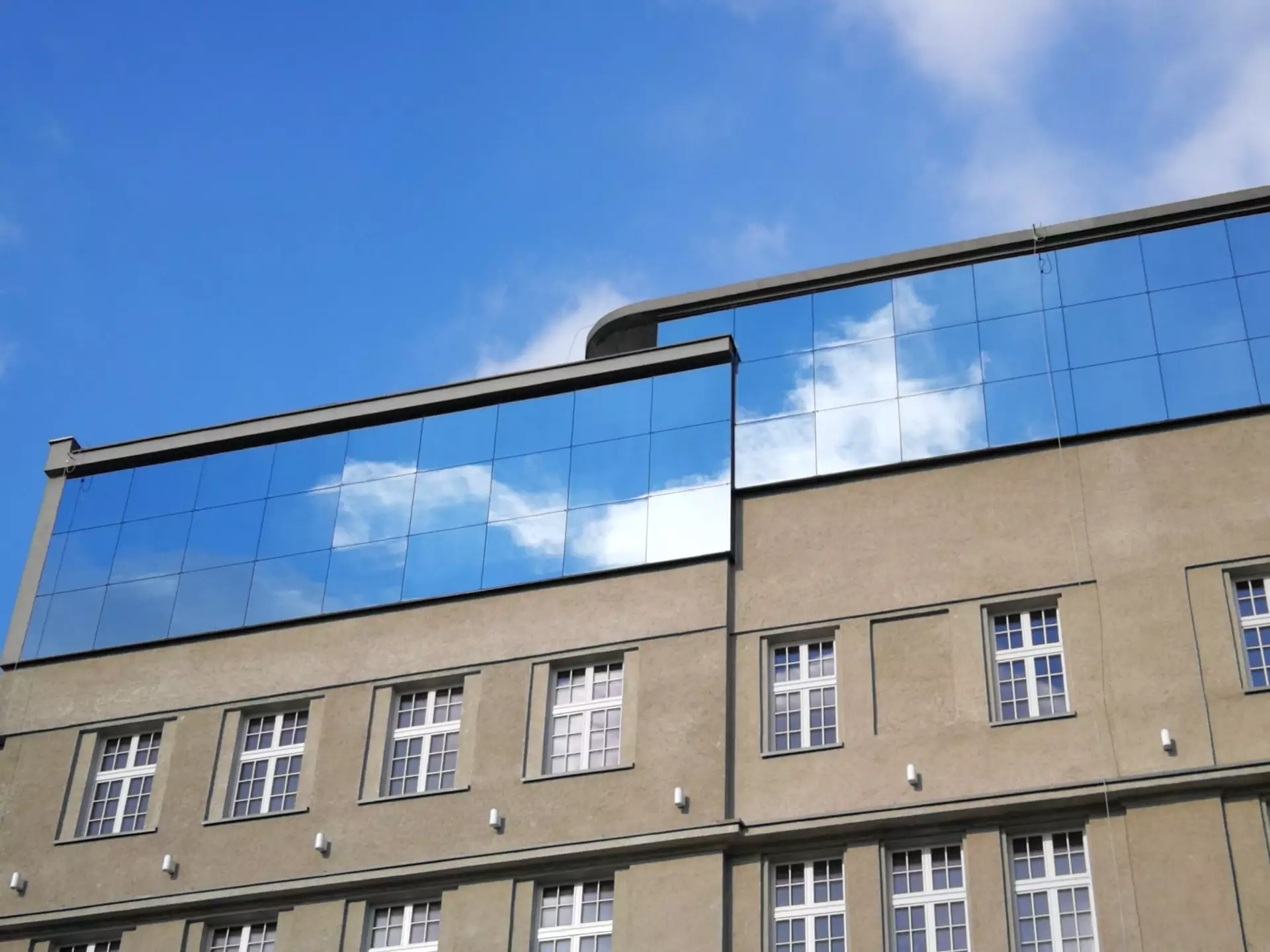 Fasada pełni głównie role okładziny oraz w pewnych fragmentach „drugiej skóry” budynku. W tym celu wykorzystaliśmy szkło refleksyjne dające efekt lustra weneckiego, co podkreśliło prestiż obiektu.