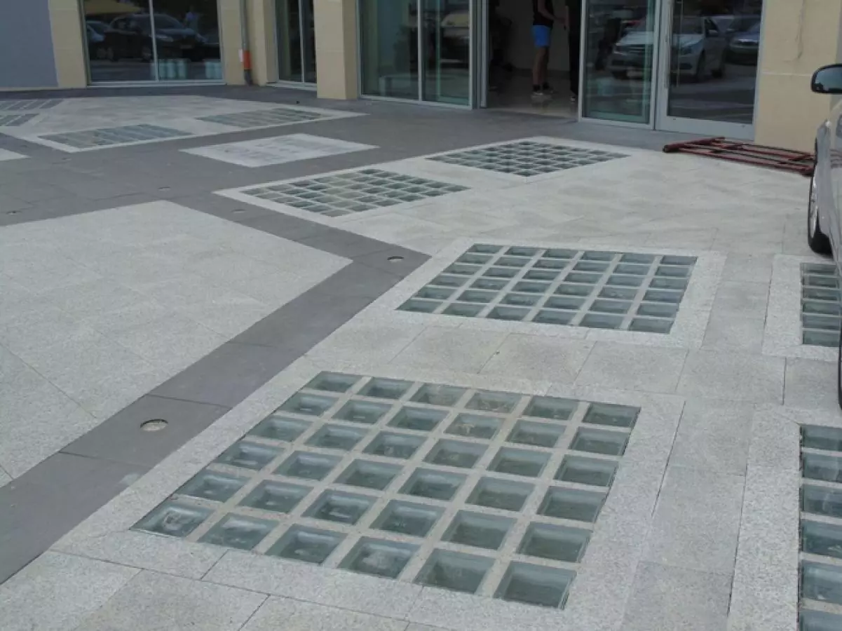 Przeszklenie podjazdu hotelu White zostało wykonane z pustaków szklanych ognioodpornych klasy REI60.