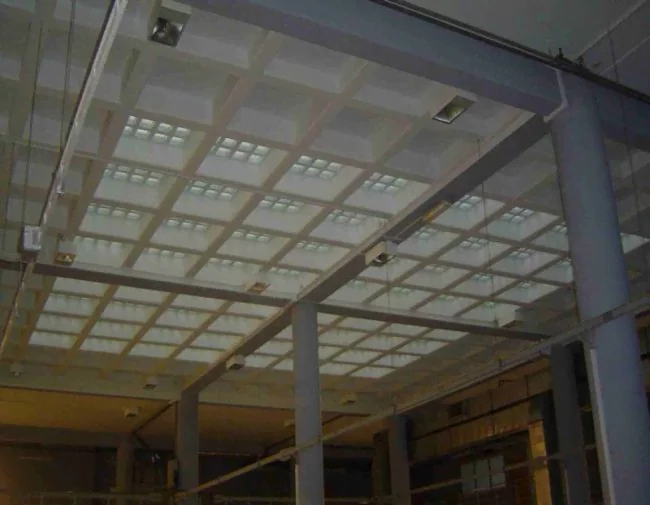 Wykonanie stropu z pustaków szklanych ognioodpornych podłogowych REI60. Wykorzystując szklane pustaki podłogowe ognioodporne, stworzyliśmy nietuzinkowy strop w budynku Politechniki Wrocławskiej. Naszym celem było uzyskanie nowoczesnej i lekkiej przestrzeni, która prezentuje się niebanalnie zarówno z parteru, jak i z pierwszego piętra. Jednocześnie chodziło o to, by ostateczny rezultat był zarówno estetyczny, jak i funkcjonalny. Żeby osiągnąć zamierzony efekt, wykorzystaliśmy właściwości nowoczesnych pustaków szklanych. Dzięki nim udało się uzyskać rezultat, który doskonale wpisuje się w nieco industrialny, modernistyczny charakter wnętrza.